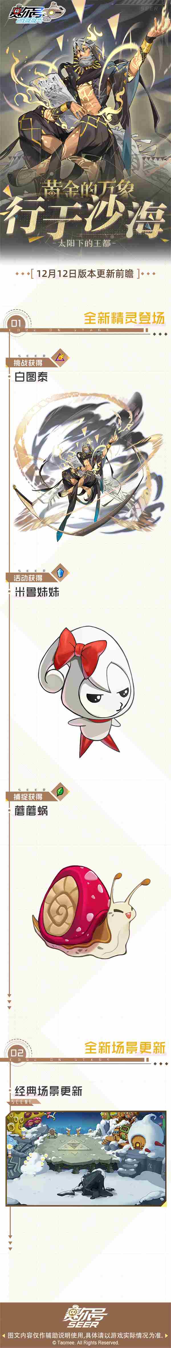 亲爱的小赛尔,12月12日赛尔号新版本“行于沙海”即将上线!◆全新精灵【白图泰】【米鲁妹妹】【蘑蘑蜗】即将登场!◆经典场景【斯诺星】即将更新!看看下面的长图,就能了解新版本的更多信息啦~
