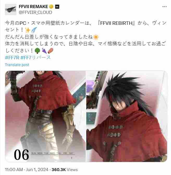 《最终幻想7:重生(FinalFantasyVIIRebirth)》官方公布了6月日历壁纸,本次的主角是文森特·瓦伦丁。官方配文表示:太阳正逐渐变得越来越强烈,会消耗你的体力,所以请利用树荫、遮阳伞和我的棺材!《最终幻想7:重生》是《最